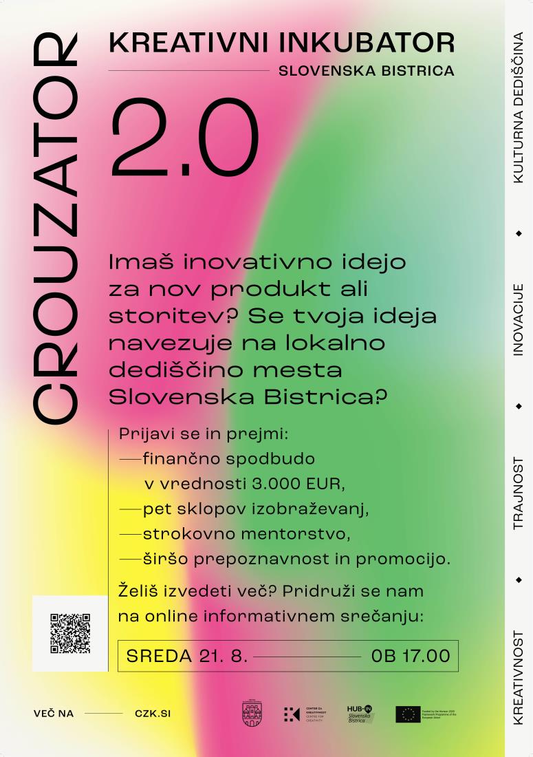 povezavi >> Na informativnem srečanju boste izvedeli več o Kreativnem inkubatorju Crouzator 2.0, priložnostih in koristih sodelovanja v programu in postopku prijave ter imeli možnost zastaviti vprašanja. V okviru javnega poziva bomo izbrali ideje